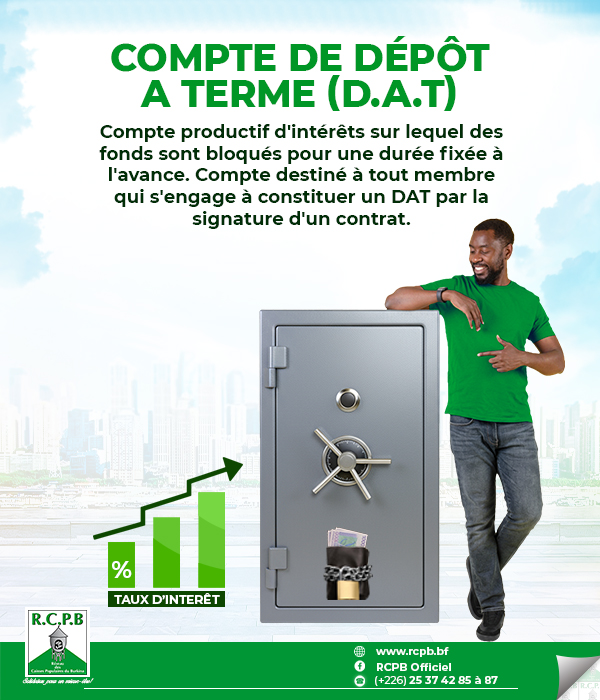 Le Dépôt à terme (DAT) ou compte bloqué permettant à terme la réalisation de projet. Le compte est rémunéré sur les économies placées.